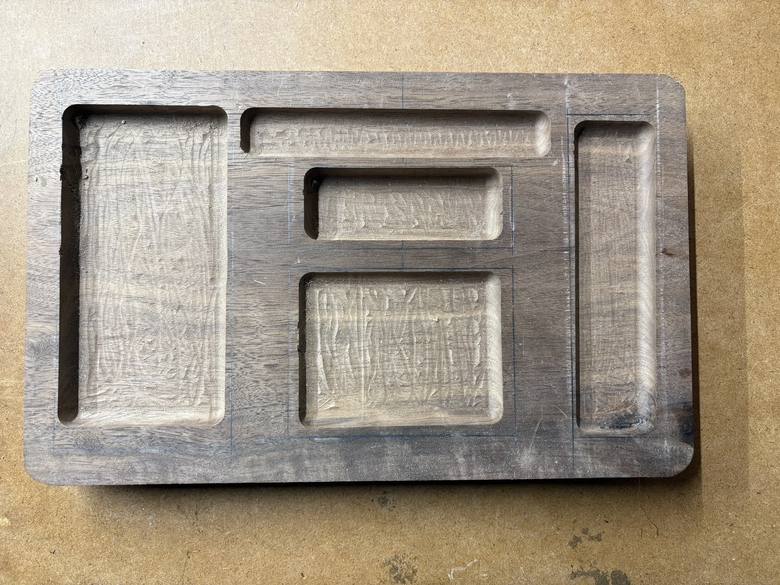 This design was going to fix all of the problems of the Chunk o’ Walnut design. It would be smaller, lighter, and not subject to as much moisture related wood movement. It also wouldn’t be as proscriptive of what could be placed in the tray. Here, I took two pieces of very high grade baltic birch plywood and glued them together. Once together I then cut them to a specific size, making sure the edges were completely flush between the pieces. I then planned on routing out a large cutout that gave the tray edges but did not cut through all of the plywood. I had hoped to make the cutout about half an inch deep.