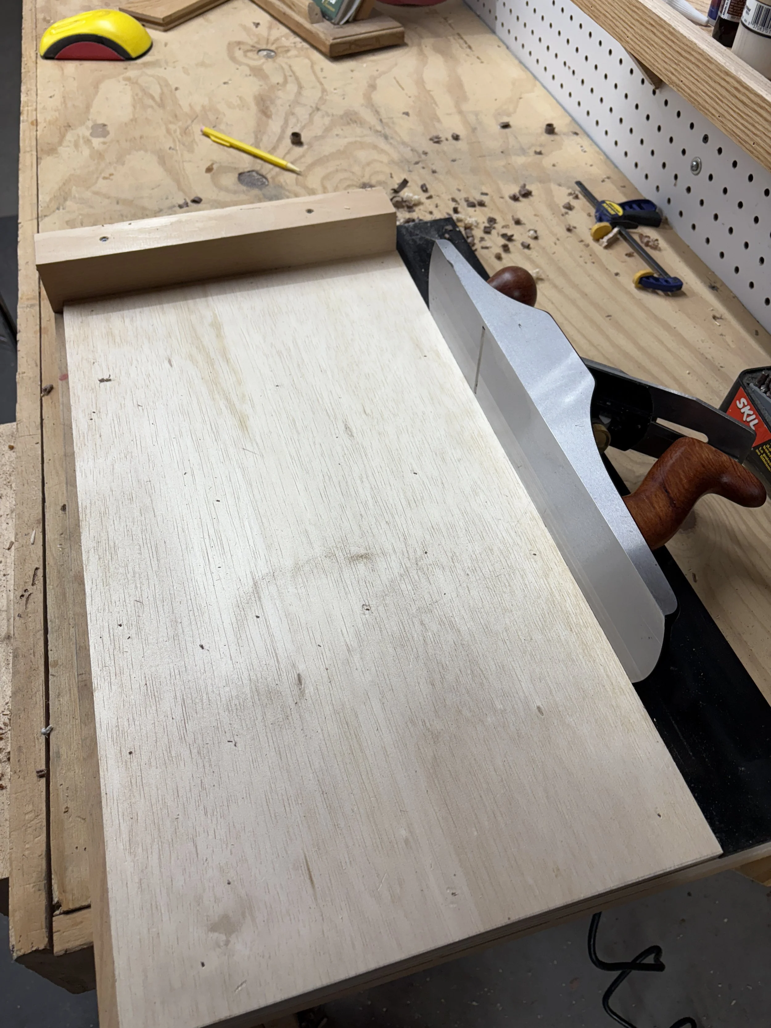 It did require me to build a shooting board so that I could sneak up on that air tight fit for the walnut sides. Here is the shooting board with ultrahigh molecular weight polyethylene taking the place of a waxed piece of wood: