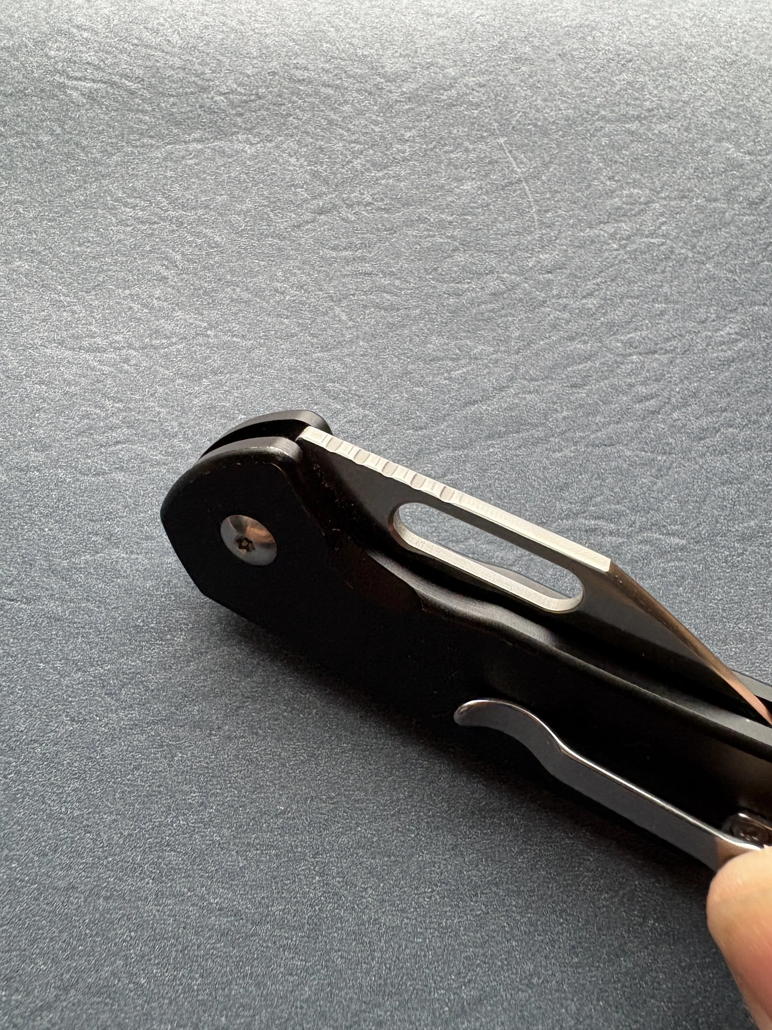 The clip here is a pretty generic over the top pocket clip and I am not mad at it, but I don’t love it either. The pass through for the screws is right at the bend in the clip and the result is that the clip is quite wide right where the knife hits your palm. It has caused a hotspot and given the size of the knife that’s not terribly surprising.