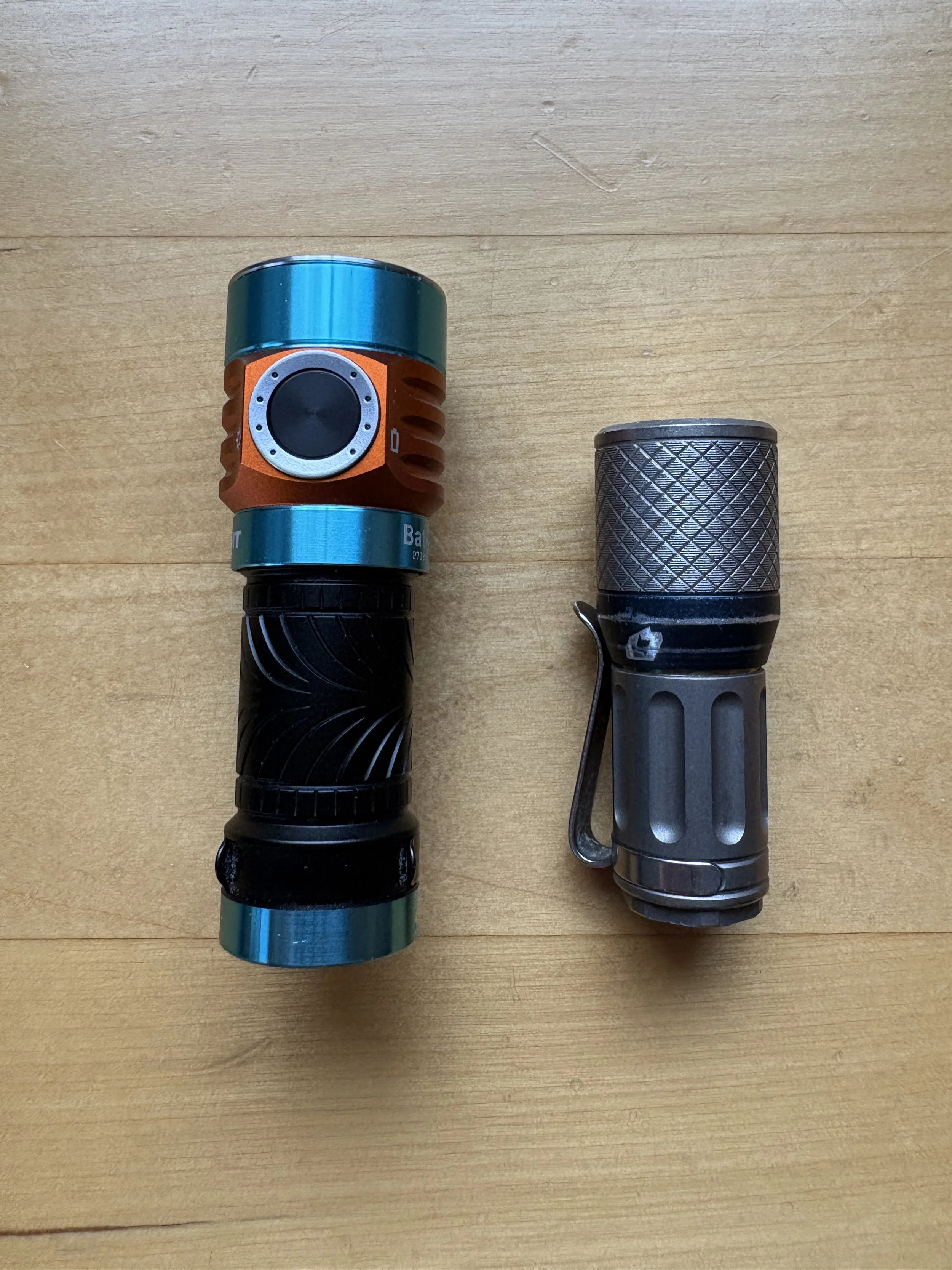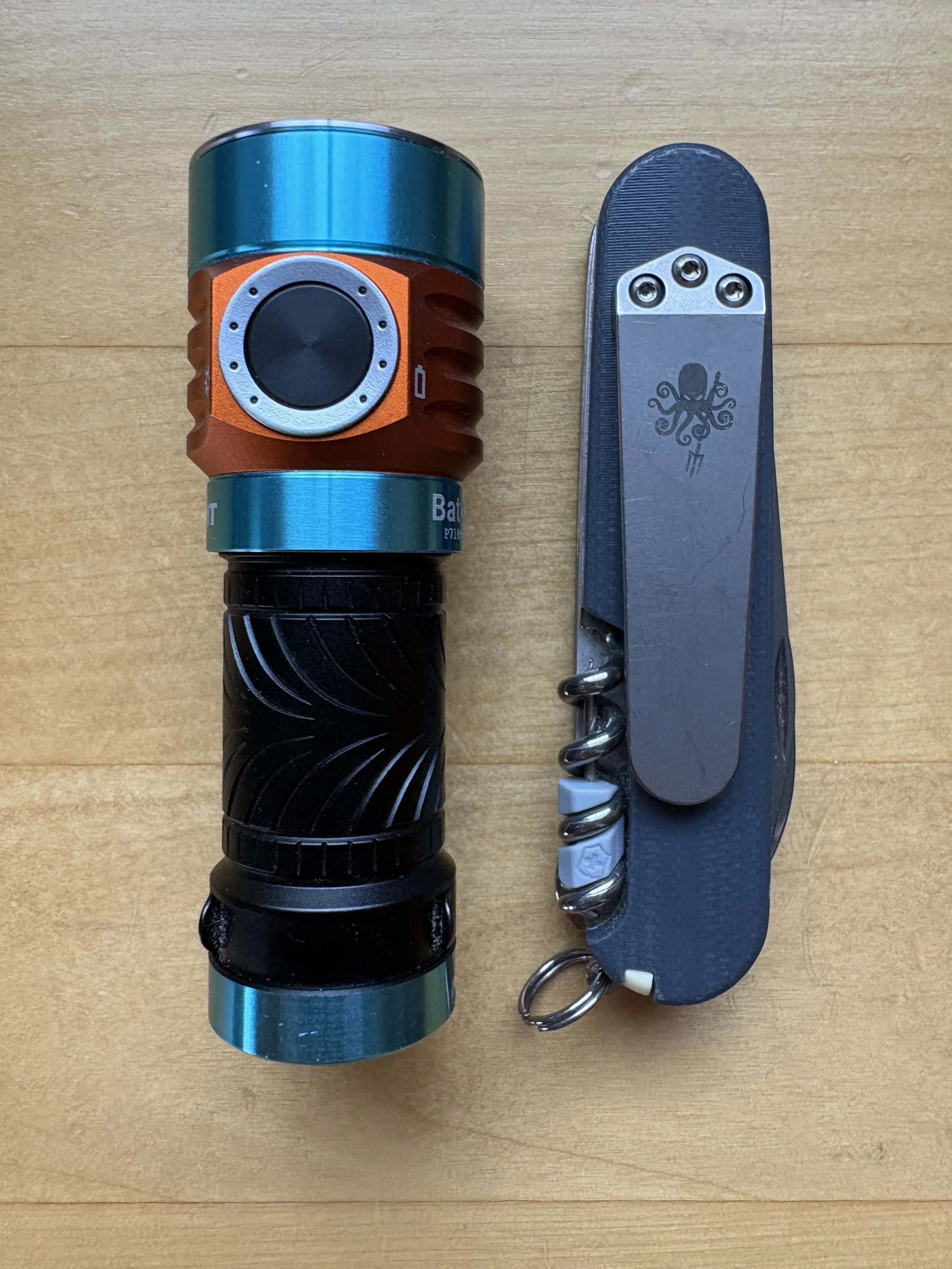 But there are others. While the beam shape is beautiful and the throw is great, the tint is, well, par for the oLight course, which is to say barforama. I don’t need everything to be a perfect HiCRI rosy tint mini suns, but oLight could pretty easily upgrade. The Nichia 219b is old, but it would be a huge improvement. Of course, Batons aren’t the most enthusiast driven lights—they are the Spyderco Delica of the flashlight world (interestingly the Delica comes in lots of high end steels). And these emitters are definitely the VG10 of emitters (VG10, long time readers will remember, is a steel I hate). The other things I dislike. I think pretty much every light needs light escapes (sublte crenellations around the bezel). I’d also like to see RGB secondary emitters as locaters (the Lumintop Tool AA v3 spoiled me). Finally, I think the tail-mounted magnet thing has run its course. It can snap to keys and knives making extraction a pain in the butt.