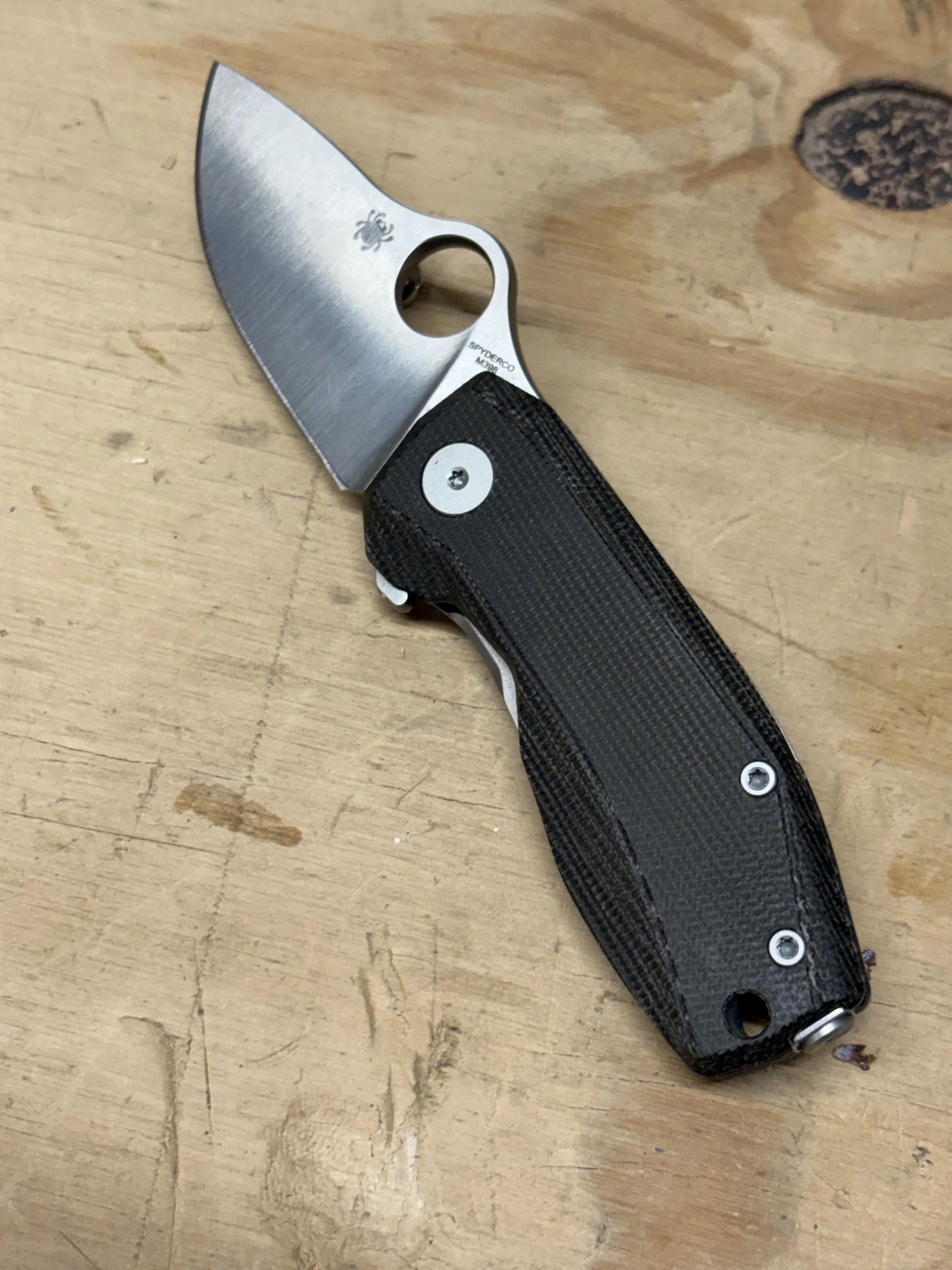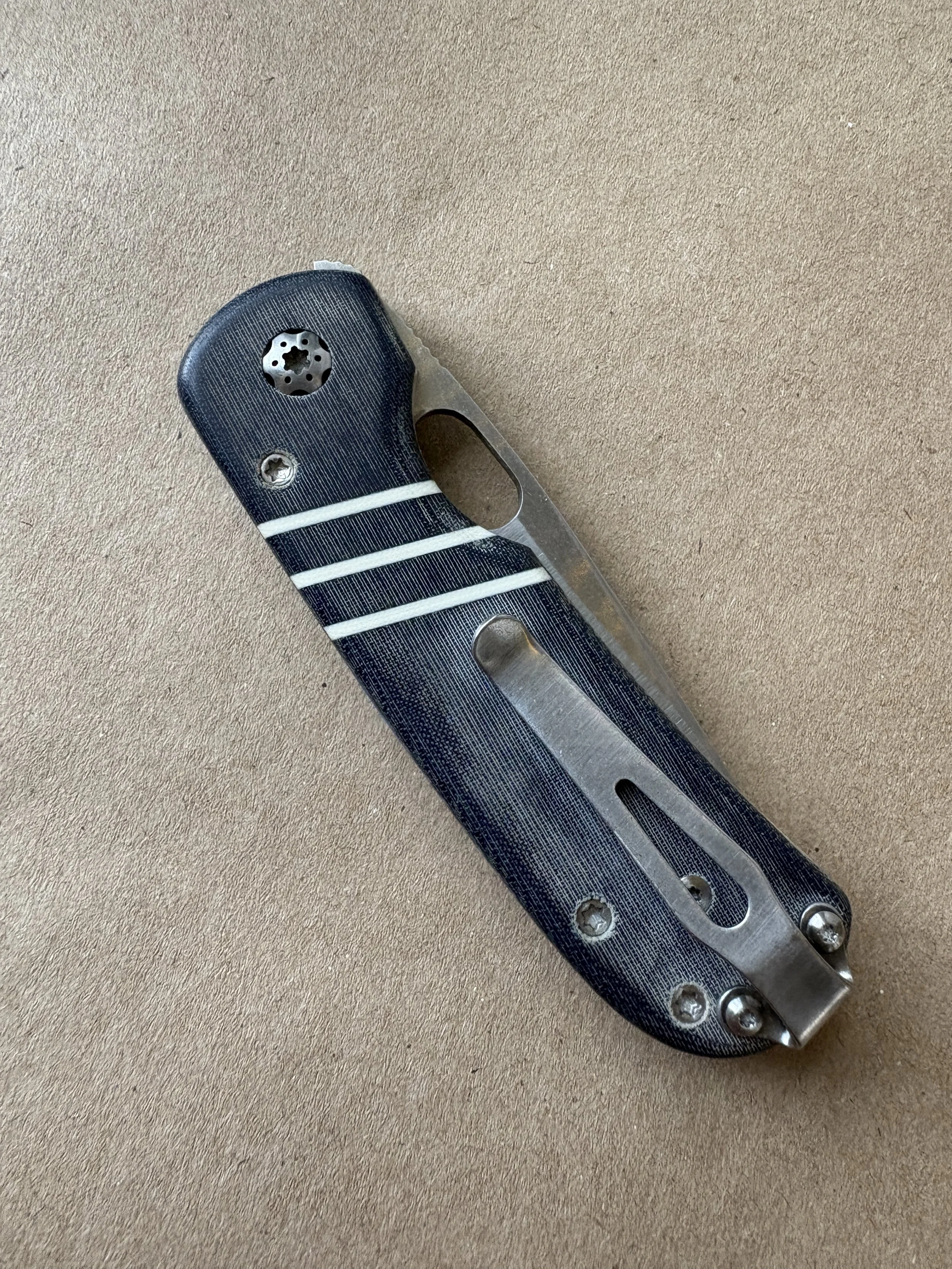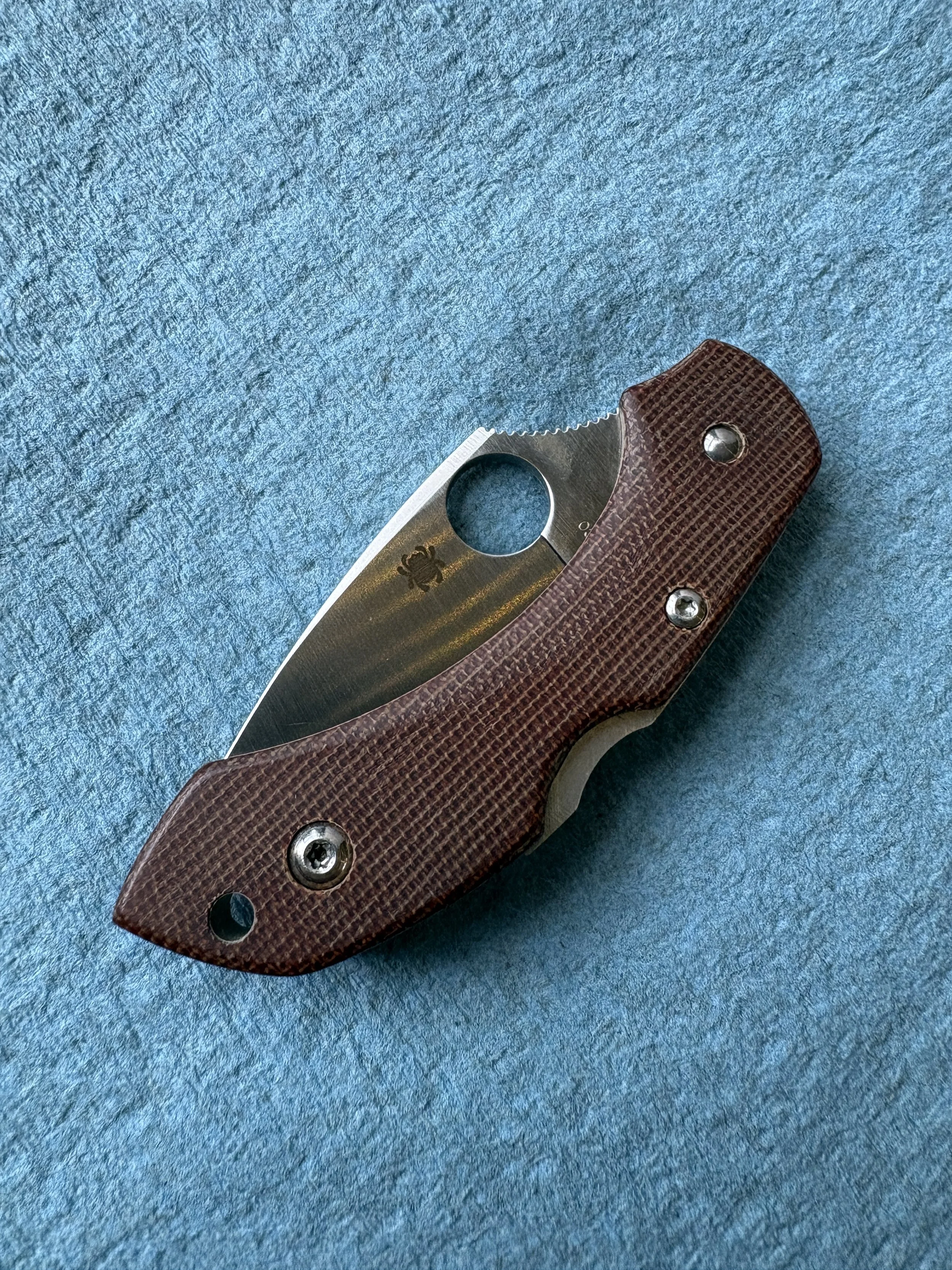 Oiling tends to accelerate the process of wear. It also ensures that the darkening is even and consistent across the knife. It smoothes out the handle as well without impacting grip much, if at all. The overall visual effect of oiling micarta can be dramatic, especially if the substrate color is dark. Black, green, and gray all really pop, becoming deep rich versions of themselves. Tan micarta undergoes a pretty dramatic change as well. Here is my new Spynano before oiling: