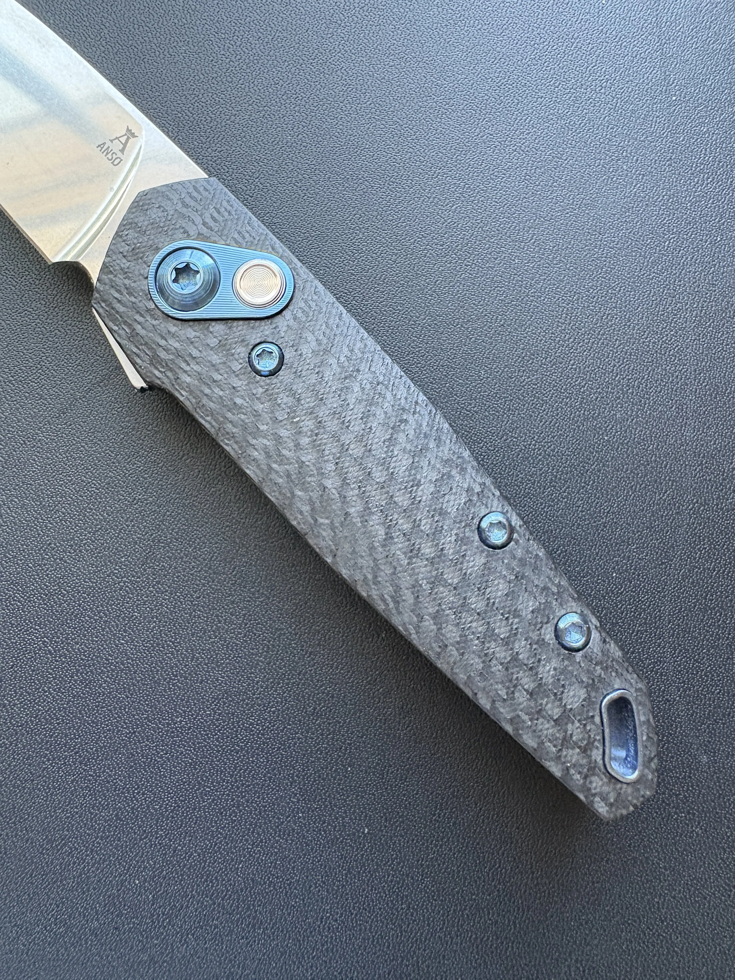 The praise for the button locks typically here goes deep. Its well made, as I mentioned above, it doesn’t hinder deployment, as I also mentioned above, and yet it still locks up tight as a drum with zero blade play in any direction. There is galling or lock stick, just locked or unlocked. While not ambidextrous, you can operate the blade without having your fingers cross the blade path. Like everything on the Aros, the lock here is perfect. Its even housed in a decorative element with the pivot that visually anchors the knife and guides your fingers. Chef’s KISS!