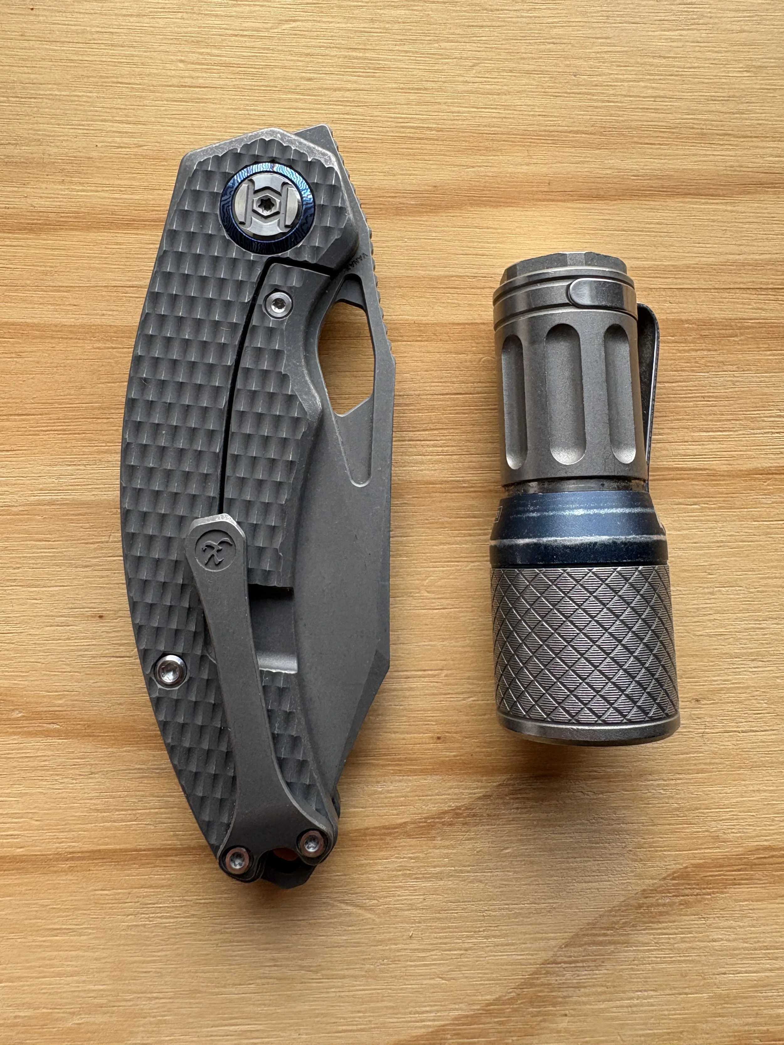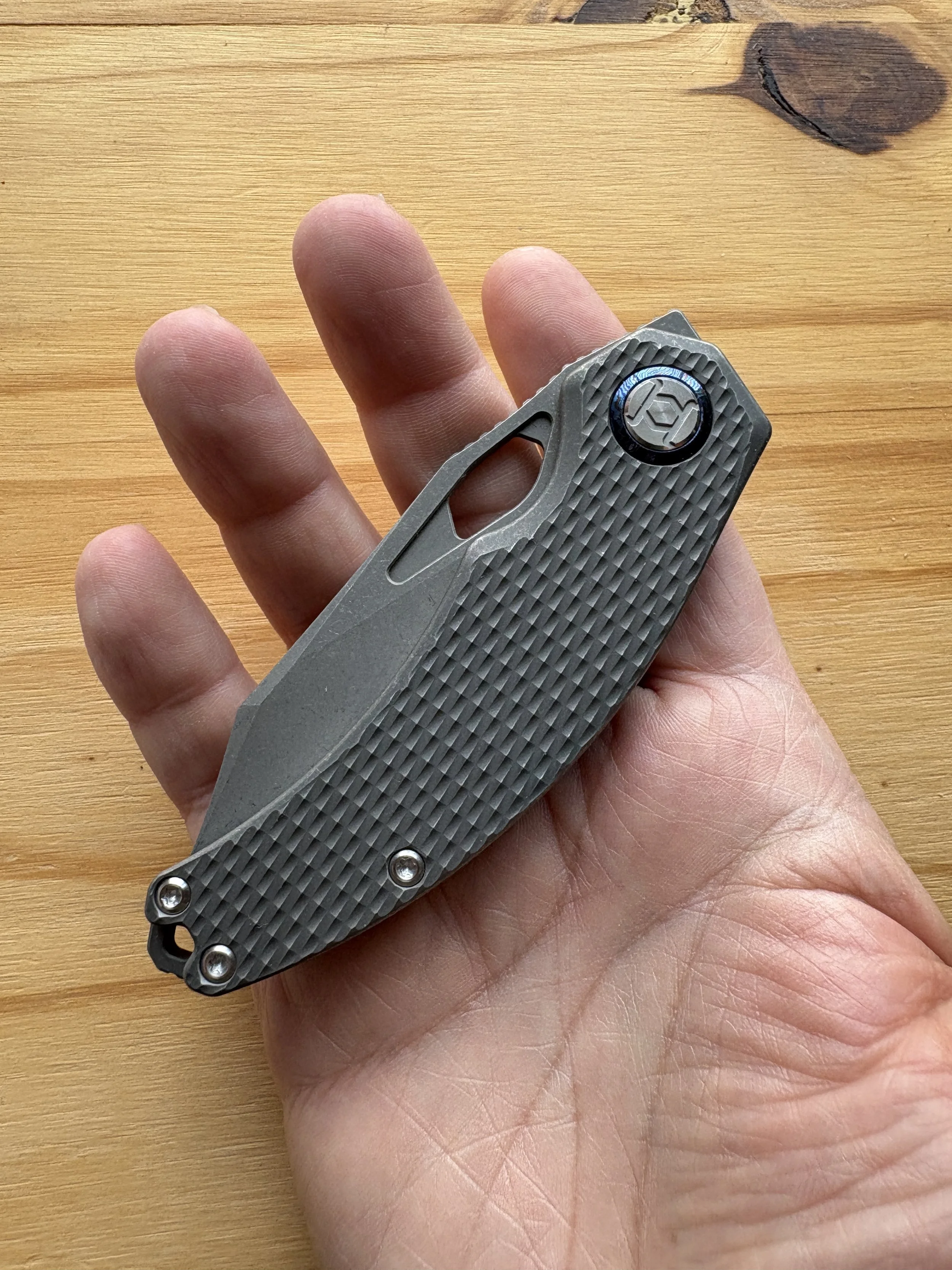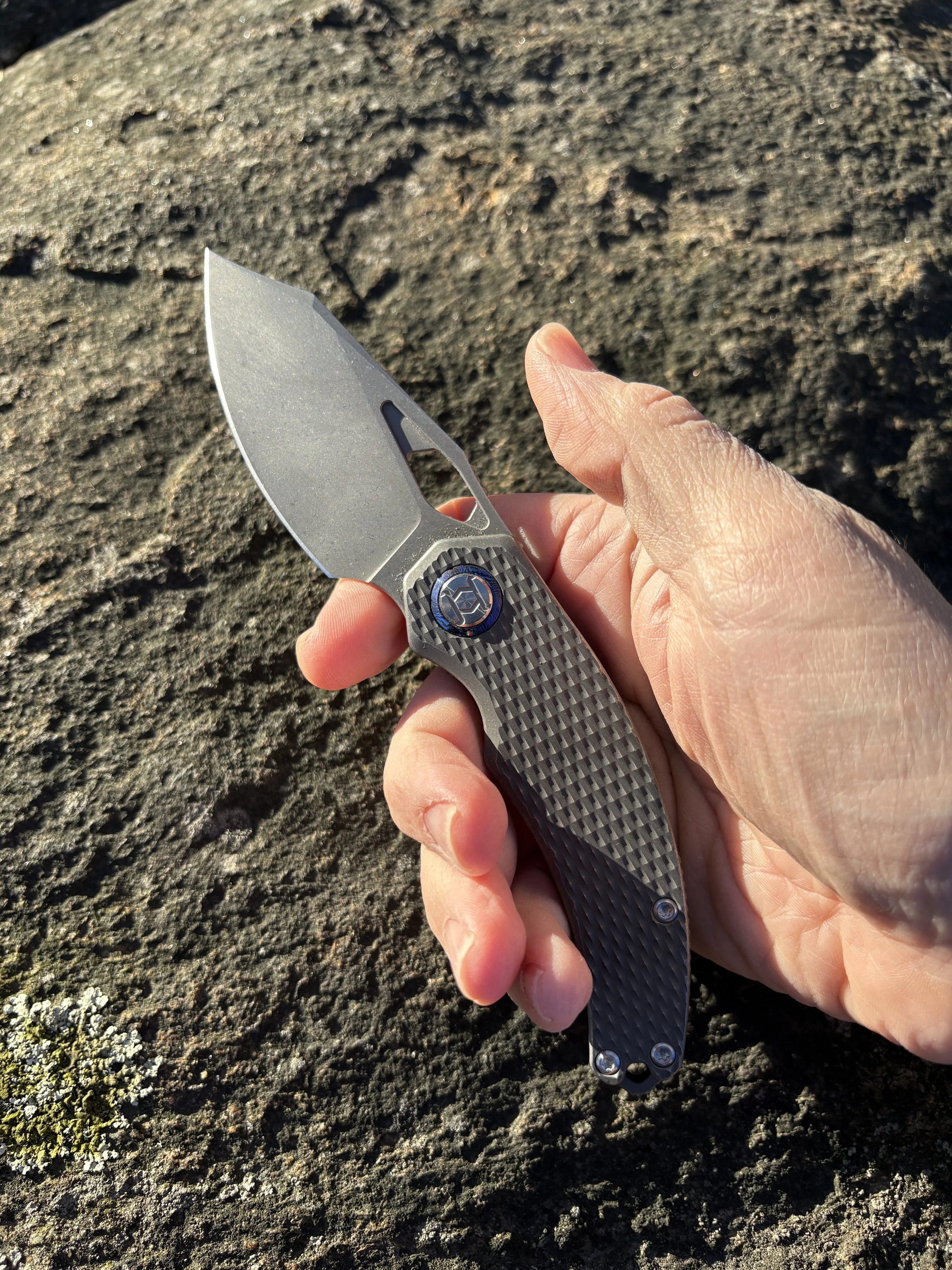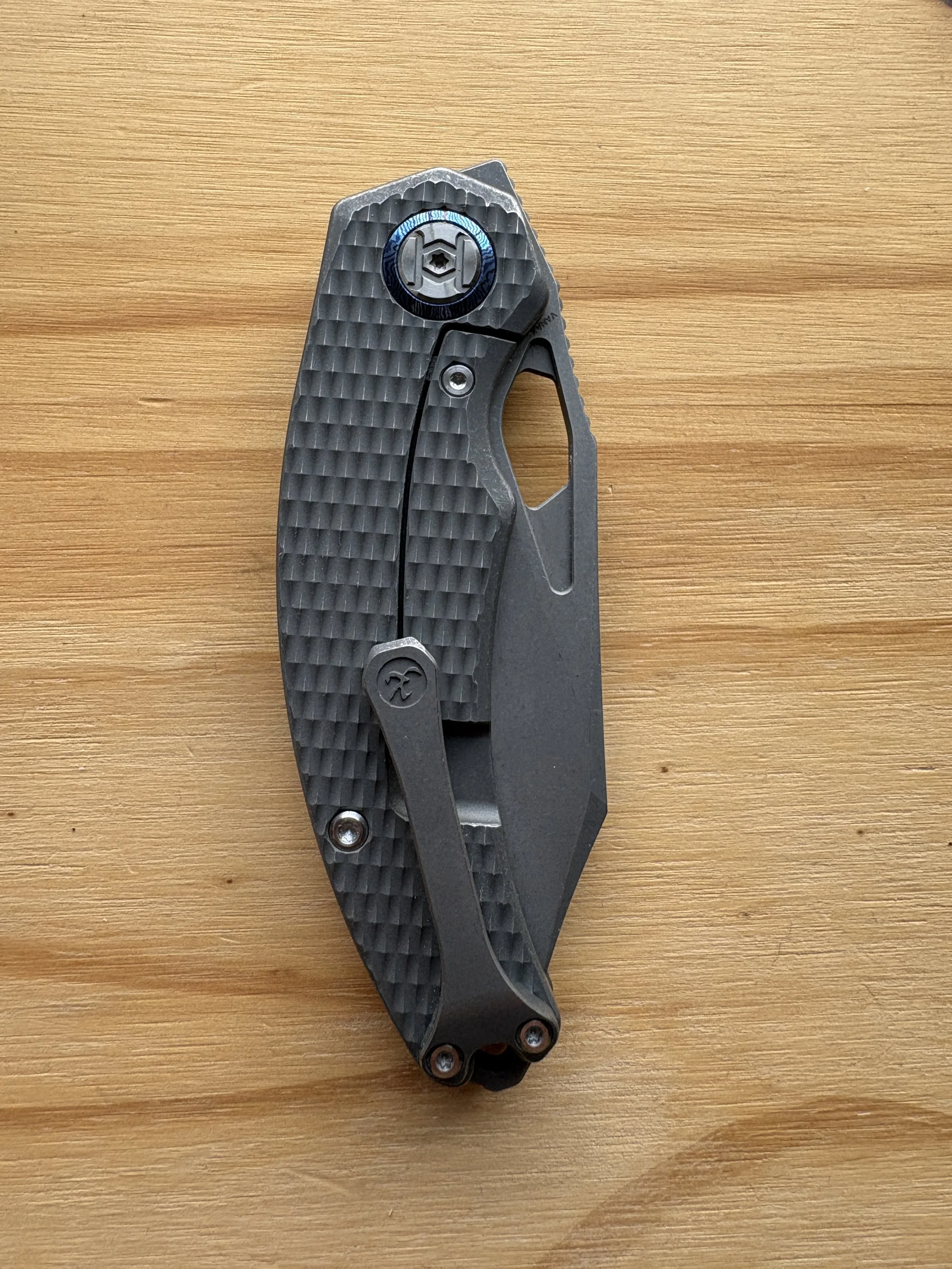 This is not a Subtle Knife, but that doesn’t mean it is a bad one either. There is a lot of busy stuff going on here—the blade, the spine, the handle, the handle texture. All of it strikes me as a bit much. But the funny thing is, none of it is bad in use. It reminds of Count Dooku’s lightsaber and not just because it is a pistol grip knife, but because it has a layer of opulence (see: Moku Ti pivot collar). And like with Dooku’s lightsaber all of the gilding doesn’t detract from the performance of the blade. This is a thin, slicey knife with excellent in hand feel. I am not a huge fan of its appearance (and the fact that I had to break my solemn vow NOT to buy gear with Moku Ti aka Rainbow Trash Metal). I would also note that the blade is a bit of a guillotine. It is a bit heavy and the thumb is in the blade path. But…the knife works really, really well despite these two minor dings (which together add up to the one point off).