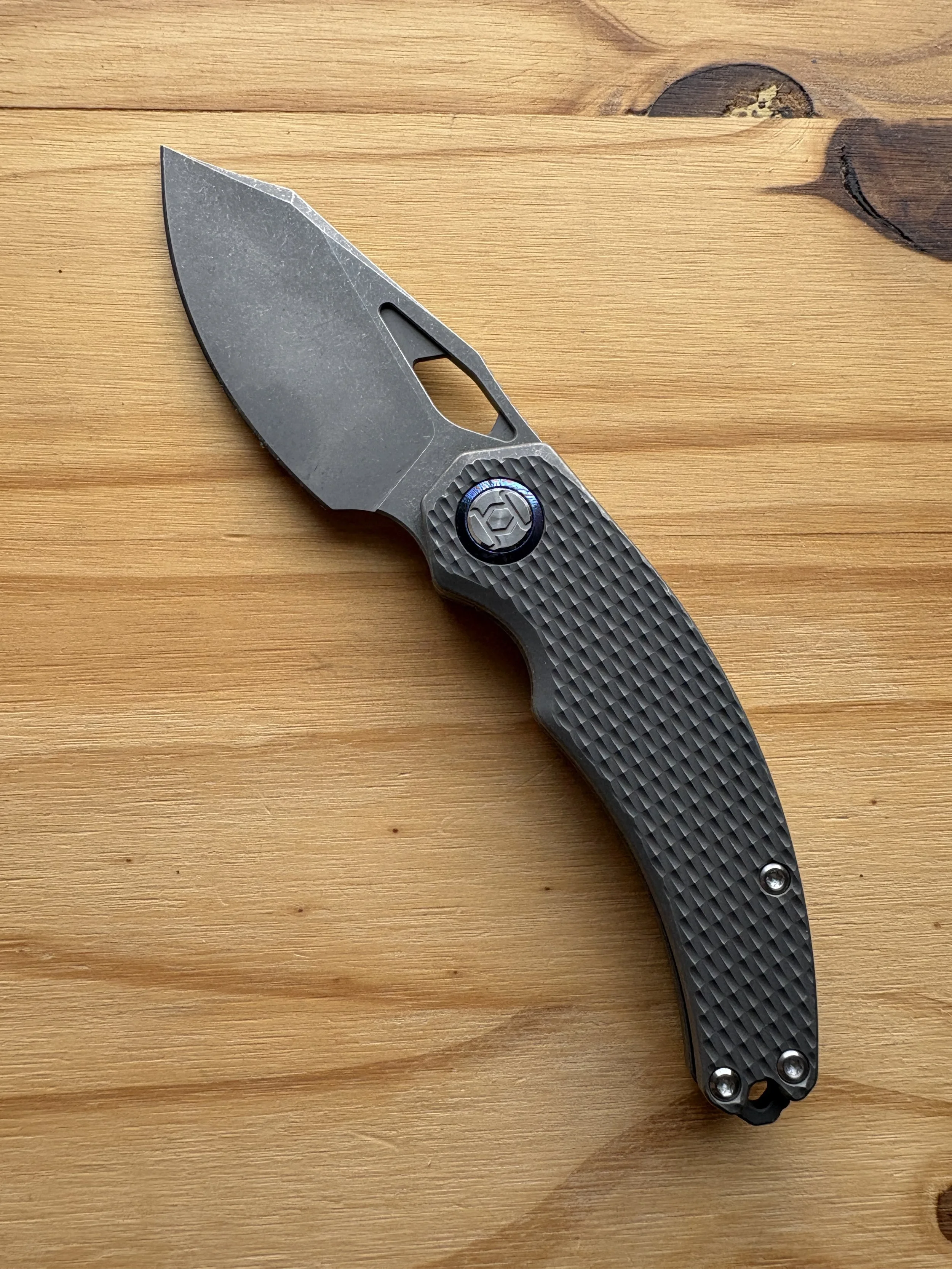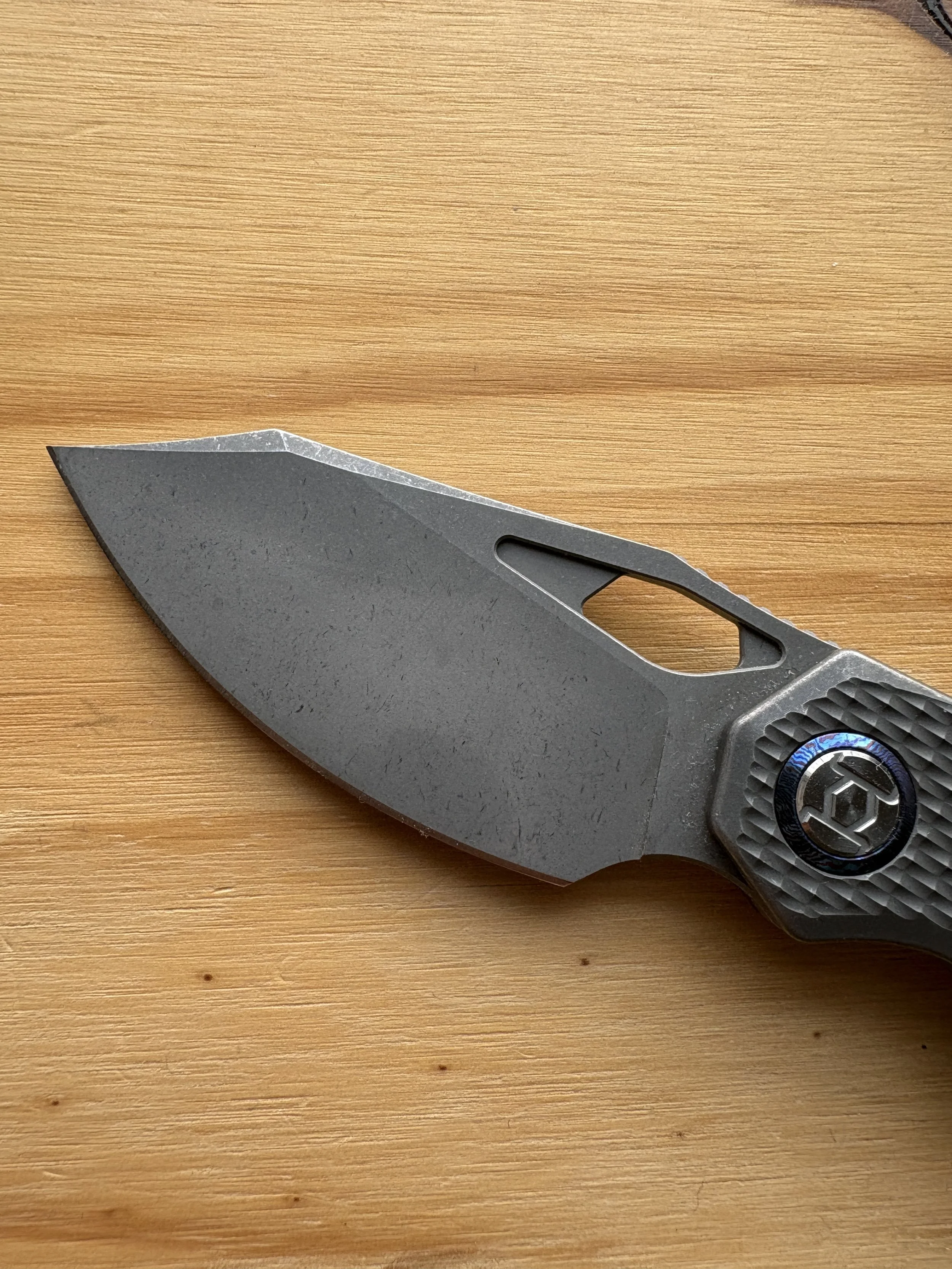 With a bit of guillotining due to the blade shape, this is not a knife I feel 100% comfortable fidgeting with, especially after nicking my thumb three times.
