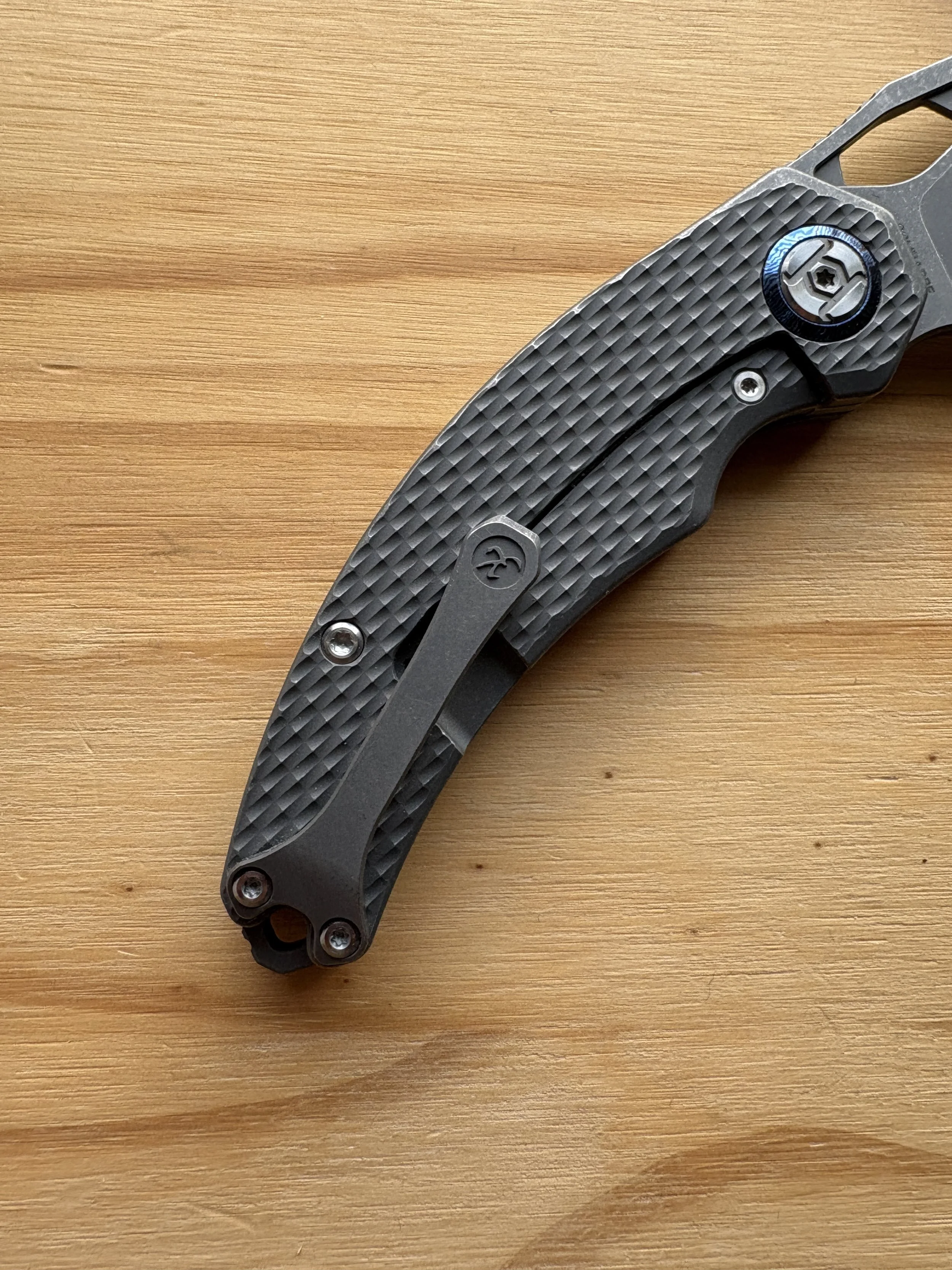 In terms of fit and finish, there is nothing to complain about with the Compadre. There is a lot of work here, like one of my early favorite high end machined Chinese knives, the Begg Knives Mini Bodega. The diamond pattern, the clip, and the blade all have serious complexity and it is all very, very well done. In fact, of these knives that are machining feats, the Compadre is probably the best or second best (with the Torrent finishing first). And like with the Torrent the machining feats serve the overall design well.
